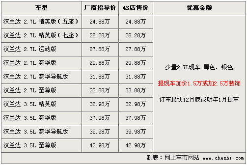據北京地區廣州豐田4S店銷售人員介紹,目前漢蘭達除2.7豪華及頂配車型有位數不多的現車外,其他款均需要預訂,但正常訂車的話需要等到年底或明年1月份提車。消費者如果提現車的話,需要加現金1.5萬元現金或者加裝2.5萬元裝飾,現車顏色有黑色、銀色可供選擇。北京地區各4S店由于訂單不同,各店銷售的現車顏色有所不同。
