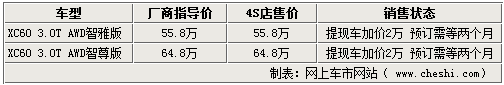 據沃爾沃汽車4S店銷售人員介紹,XC60目前僅有少量現車到店,但顏色并不齊全。由于目前沃爾沃XC60的現車比較緊張,現在購車仍然需要預訂,兩個月左右便可以提車,如果消費者想要店內購買提車的話,需要加價2萬元。