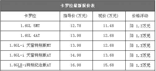 最近一段時(shí)間,卡羅拉的銷售情況一直都非常不錯(cuò),因此其價(jià)格相對來說也比較穩(wěn)定。近日,我們從北京的一些一汽豐田汽車綜合經(jīng)銷商處了解到,目前卡羅拉可優(yōu)惠1.3萬元,比9月份的價(jià)格下降了3000元,和其歷史最低價(jià)已經(jīng)非常接近。以下是卡羅拉部分車型最新報(bào)價(jià)表: