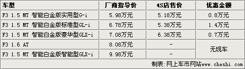 據比亞迪汽車4S店銷售人員介紹,目前比亞迪F3智能白金版只有實用性、標準型和豪華型有現車銷售,智能型和自動擋車型都沒有現車,及時預訂也無法得知具體到店時間。現在購買比亞迪F3智能白金版可以有較大的優惠幅度,其中實用型優惠8000元;豪華型可以優惠7000元;而標準型最高則可以優惠1.4萬元。該比亞迪4S店銷售人員表示,如果到店詳談,還可以有更多的優惠幅度。