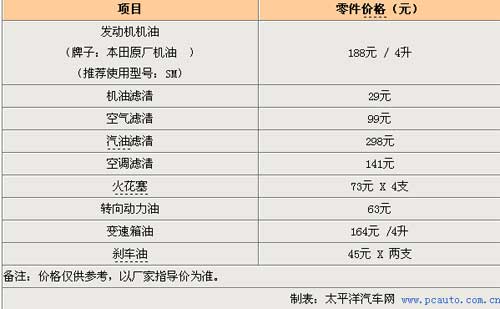 廣汽本田為雅閣提供3年或十萬公里的質保期限,首保是在5000公里,以后每過5000公里保養一次。與大多數日系車型相同,廣汽本田對雅閣車型機油機濾更換周期的官方建議是5000公里,廣汽本田4S店一般建議車主使用級別較高的SM級本田原裝機油。每次常規保養用料費用為217元,加上200元的更換機油機濾工時費一共是417元。在4萬公里內進行常規保養總共6次。到了2萬公里的時候,車主要在常規保養基礎上增加空氣濾清與空調濾清的保養,保養費用也相應的增加,需要707元。而到了4萬公里的時候要進行一次大保養,需要更換機油機濾、空氣濾清、空調濾清、汽油濾清、火花塞與變速箱油,而保養費用也需要過千元,達到1611元。