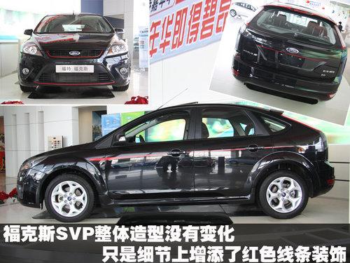 就外觀而言,福克斯SVP版車型在整體輪廓上沒有改變,只是在細節處增添了幾分運動色彩。車身顏色采用磨砂黑,并配以紅色飾條,使整體看起來更加精神,好似一副賽車模樣。紅色飾條被安排在進氣格柵處,當然尾部也與之相互輝映。車身側面棱線也被包裹,沿前輪眉處一直延伸至尾部。除此之外,尾燈及第三剎車燈出也被紅色線條包圍,這車好似被焰火圍住,充滿了激情。輪轂這次發生了較大變化,獨特的造型更加運動、個性,與外觀配合一起極為默契。