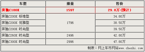 目前,北京奔馳新C級轎車共有3個排量五款車型,而入門級車型奔馳新C200K 標準型的售價為34.8萬元。由于奔馳新C200K 標準型在經(jīng)銷商處可以優(yōu)惠2萬元左右,所以奔馳新C180K車型作為奔馳新車的入門車型,預計售價為29.8萬元。同時,與售價分別為28.3萬和29.1萬的寶馬318i和奧迪A4L1.8T形成真正的抗衡。