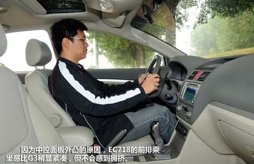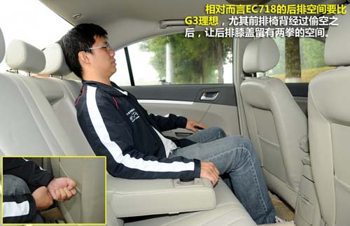 EC718的儲物空間跟G3不相伯仲,但EC718卻贏在細節處理上面。例如他的遮陽板是帶有夾子的、扶手箱是分兩層的、門板是可以放飲料的、手剎旁的兩個杯架底部是高低不同的(避免飲料干擾檔桿)、后排是設有煙灰缸的等等。