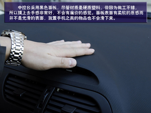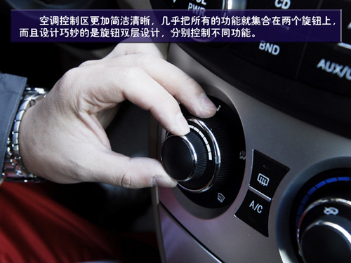 空調控制區(qū)就更加簡潔了,幾乎把所有的功能就集合在兩個旋鈕上,而且設計巧妙的是旋鈕雙層設計,分別控制不同功能。但在使用時我們發(fā)現旋鈕的指示標是一個小的凹槽,在光線不足是可以看到是一個小燈,但在白天時這個凹槽并不十分明顯,可能會造成讀取的小障礙。