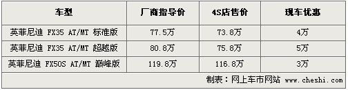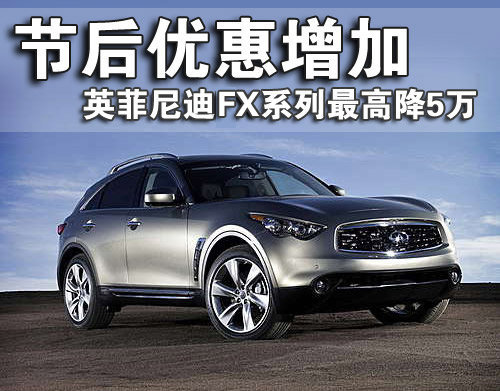 筆者了解,目前英菲尼迪FX系列主要銷售車型為FX35超越版,標(biāo)準(zhǔn)版現(xiàn)車較少,需要預(yù)訂,頂配車型也要3月份左右才能提車。相比節(jié)前的優(yōu)惠幅度,目前一般金色、白色黑色等現(xiàn)車可優(yōu)惠4萬元,少量庫存車最高可優(yōu)惠5萬元。銷售人員介紹,F(xiàn)X50S為運(yùn)動(dòng)版,和FX30相比,除了在動(dòng)力排量上的差異外,還增加了DVD娛樂系統(tǒng)等高端配置。