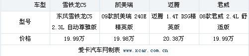 本次選取了4款車中售價約為20萬的4個車型進行橫向數據對比。通過對車身尺寸,動力配置,安全性及舒適性配置的數據對比為您選購愛車進行比較。因為此次我們選擇的是價格區間非常接近的4款車型,沒有考慮排量和高低配的因素,所以在各項配置方面各車型之間存在一定差距。