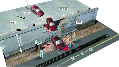 走進駕校場地,可以看到,學車的場地邊有高約20厘米的圍欄和更高更敦實的隔離墩。從現(xiàn)場看,肇事的教練車先是撞破了圍欄和隔離墩,然后才撞破了圍墻,飛到了落差達2米之下的人行道上。
