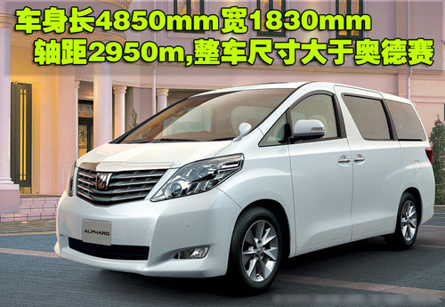 目前日本本土銷售的豐田Alphard是其第二代車型,分為兩驅(qū)和四驅(qū)兩個(gè)版本,兩驅(qū)車型的車身長4850 mm ,寬1830 mm ,高1890mm,四驅(qū)車型的車身長為4850 mm ,車寬1830 mm ,高1905mm,而軸距均為2950mm。