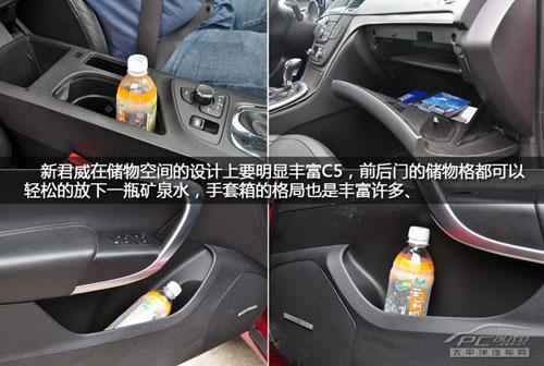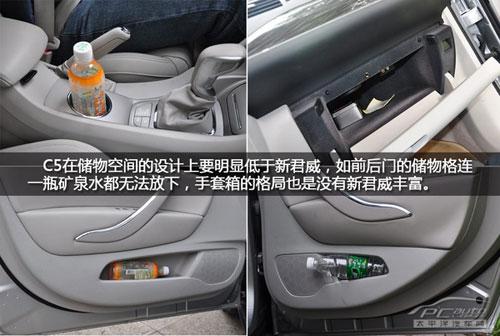 車內儲物空間我們用的是“飲料瓶”來衡量看看究竟那款車更人性,新君威車內的儲物空間設計相當人性化,前后側門的儲物格能放進去飲料瓶,手套箱的儲物格局也是很豐富,排擋前方預留了2個飲料瓶的儲物槽,但是中控臺上方對于票據、錢包、手機等雜物空間設計就沒有C5那么人性。
