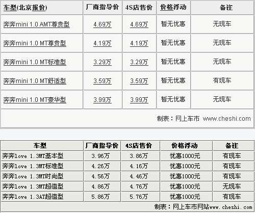 長安奔奔系列在國內微型轎車市場可算是家喻戶曉,隨著系列產品的不斷繁衍,目前該品牌系列共推出了奔奔i、奔奔love和奔奔mini三款車型。目前奔奔I車型已經全面停產,其他兩款車型繼續在國內小型車市場打拼,由于車型定位年輕,關注度也十分高。網上車市最近走訪了長安汽車北京地區4S店,對奔奔love和奔奔mini兩款車最新的市場情況進行了了解,具體信息請參考下表: