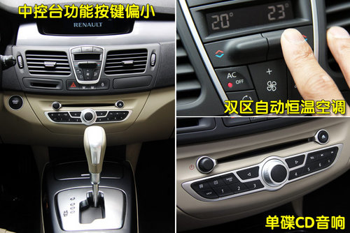 中控臺中細小的按鍵不知道法國人何時能夠為此改變一下,想當初進入到C5車內時,被琳瑯滿目的小按鍵搞的暈頭轉向,并且在駕駛時我是不敢隨意去觸碰那個區域的。不過還好拉古那中控臺按鍵并不是很多,空調區域的造型很時尚,也很節省空間,實際操作也非常容易上手,調節方式也很簡便。另外老款的拉古那配備的是多碟CD,而新款車型裝配的則是單碟CD音響,在日常使用中,多少會有一些不便。