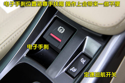 電子手剎的位置位于手扶箱前側,實際操作中按照正常坐姿會感覺到有一些不便,但該功能在使用中比較便利,按鍵阻尼的手感也比較適中,并且電子手剎的配置確實非常實用。在電子手剎旁則是定速巡航系統的開關鍵,這與前段時間評測的科雷傲相同,同樣在使用中會感到一些不便,我甚至在想,為什么不能把這個功能都整合到方向盤中呢?