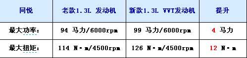 同悅全新的發動機除了增加VVT技術外,在排量上也比老款發動機有了一定的提升,其氣缸容積達到1332cc,超過了老款車型1299cc。新款發動機的最大功率達到99馬力,最大扭矩為126牛米/4500rpm。最大功率比老款大了5馬力,最大扭矩更是增加了12牛米。