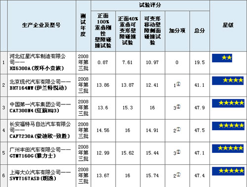 獲得五星級碰撞成績的車型還有:長安福特馬自達汽車有限公司生產的蒙迪歐牌CAF7230A型轎車(蒙迪歐致勝)、廣州豐田汽車有限公司生產的豐田牌TOYOTA GTM7160G型轎車(豐田雅力士)、上海大眾汽車有限公司生產的朗逸牌LAVIDA SVW7167ASD型轎車。北京現代汽車有限公司生產的北京現代牌BH7164MW型轎車(悅動)獲得四星級成績。河北紅星汽車制造有限公司生產的紅星牌HX6300A型旅行車(雙環小貴族)僅獲兩星級成績。