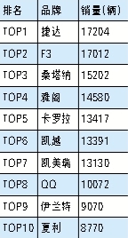 與上月相比,桑塔納和雅閣排名提前,QQ再次進(jìn)入前十名,表現(xiàn)也較為出色。