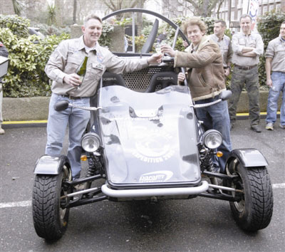 風扇汽車既可以在崎嶇不平的沙地飛馳,又能像飛機一樣在空中飛行。在降落傘和一個巨型風扇發動機的幫助下,探險家們計劃先在安道爾附近的比利牛斯山脈上空飛行,穿越14公里長的直布羅陀海峽,接下來,將飛越摩洛哥阿特拉斯山脈和撒哈拉沙漠,哪里沒有了公路,他就從哪里發動風扇發動機駕車升空。