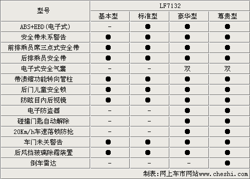 在安全配置方面,力帆320大部分車型都配備了ABS+EBD系統和雙安全氣囊。全系車型都帶有安全帶為系提示、后排安全帶、防眩目內后視鏡、車門未關警告和后風擋除霜等,提高了整車的主動安全性。另外,力帆320的高配車型還配備了倒車雷達、自動落鎖、碰撞門匙自動解鎖裝置,也大大提高了行車的安全性。