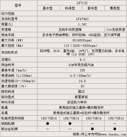 從性能方面來看,力帆320搭載自主研發的1.3升發動機,最大功率可達65kw,最大扭矩也達到了110N.m,最高車速可達155km/h,百公里等速油耗僅為4.5L。力帆320前后懸掛都采用麥弗遜式獨立懸架,并配備橫向穩定桿,提高整車的穩定性。輪胎型號為165/70R14,高配車型配備了鋁合金輪轂。