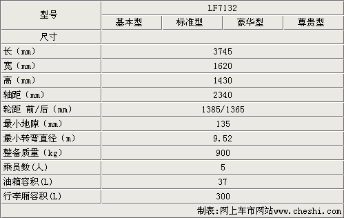 從車型尺寸來看,力帆320比奇瑞QQ3更長、更寬,2340mm的軸距也與奇瑞QQ3保持一致。力帆320的整備質量只有900kg,離地間隙為135mm,車身比較輕,穩定性也比較好。這款車的后備箱容積達到300升,放倒后排座椅以后,后備箱還有擴展的空間。