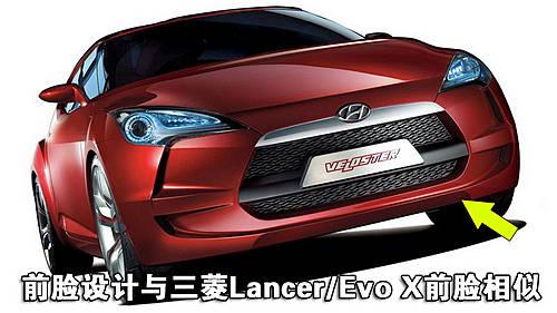 現(xiàn)代Veloster coupe概念采用的是現(xiàn)代Theta 2.0升直列四缸發(fā)動機,通過五前速自動變速箱將動力傳遞到前輪。雙車門設計,前臉設計讓我們想起了最新的三菱Lancer/Evo X前臉。