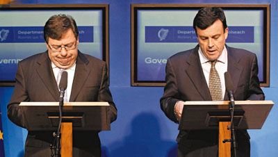 愛爾蘭總理考恩表示,援助計劃包括兩部分:首先當地銀行業需要縮小規模,出售部分非核心資產;其次是落實4年緊縮計劃,目標在2014年前削赤150億歐元,將財赤占國內生產總值(GDP)比例由目前32%減至歐盟規定的3%。