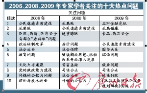 調查顯示,反腐倡廉和公民道德素質建設依然位于專家學者關注的十大熱點問題前列,分列第2位和第4位。