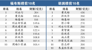 繼本月初胡潤“率先”公布《2008胡潤百富榜》之后,記者昨日在《福布斯》中文版上也看到了其《2008年中國富豪榜》,或許刻意強調與胡潤的區別,或許這一個月來全球資本市場動蕩影響確實不小,福布斯的榜單,不僅前10名與胡潤座次“大變樣”,就連“身家”也是相差甚遠。福布斯昨日披露的首富劉永行在胡潤榜單中僅列第5,胡潤的首富黃光裕也被福布斯放在第2的位置上,而財富總額也由胡潤榜中的430億元驟降至183.6億元。另外,楊惠妍在胡潤榜里財富總額達330億元,但在福布斯榜里是151億元。福布斯制榜人指出,富豪的財產是根據最新股價得出的。