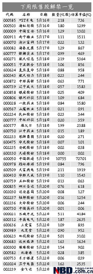 市場(chǎng)人士認(rèn)為,下周限售股解禁壓力集中在中小板的 “大小限”和有增發(fā)限售股解禁上市的這類(lèi)公司上,而股改限售股的壓力較小。