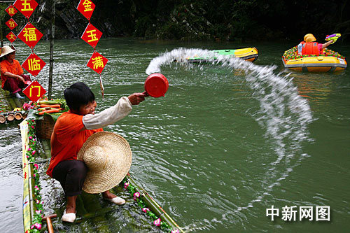中新網廣州5月26日電(記者 莫非 通訊員 慧子)十多艘用竹作為材料扎制成的龍舟,長3.8米,寬1米,前方高翹,呈龍頭形狀,并且四周遍插五顏六色的鮮花,游客在船上打水仗、潑水、沐午時水,歡笑聲不斷。而漂亮的花龍舟從廣州流溪河源頭順流而下,徜徉在從化響水峽的漫天花海中,格外壯觀。