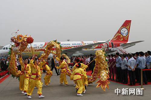 中新網成都6月23日電(楊杰 陳典路)23日下午17點09分,國內總裝的第一架空客A320飛機、“中華龍”號調機航班抵達成都雙流機場,飛機緩緩滑向停機位,兩輛噴水車為飛機“噴水洗塵”;機坪上鑼鼓聲聲,獅舞龍騰。至此,國內總裝的第一架空客A320飛機正式落戶四川航空。