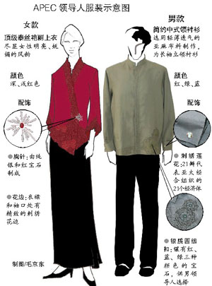 按照慣例,APEC領(lǐng)導(dǎo)人會(huì)穿什么樣的服飾亮相向來被視為“高度機(jī)密”。但這次籌委會(huì)一反傳統(tǒng),預(yù)先展示為與會(huì)的21國(guó)領(lǐng)導(dǎo)人設(shè)計(jì)的服飾,讓海內(nèi)外媒體先睹為快。