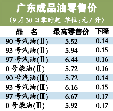 國家發改委決定從今天零時起降低成品油價,汽、柴油每噸降低190元。昨日,廣東省物價局公布了新的成品油最高銷售價格。國Ⅱ標準90號汽油每升下調0.14元,93號汽油每升下調0.15元,97號汽油每升下調0.16元,0號柴油每升下調0.16元;國Ⅲ標準90號汽油每升下調0.14元,93號汽油每升下調0.15元,97號汽油每升下調0.17元,0號柴油每升下調0.17元。(記者葉平生 通訊員岳佳綜)