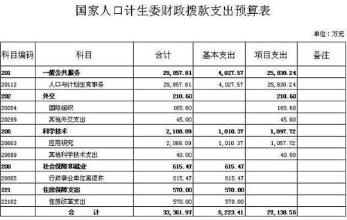 本表按支出功能分類科目編制,反映國家人口計生委年度部門預算中財政撥款支出的總體情況,按照基本支出和項目支出劃分。
