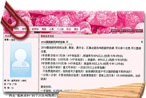 有人在網(wǎng)上發(fā)布叫賣廣告,有人在博客上叫賣,有的人在個人QQ空間里叫賣,更多的人則在一些網(wǎng)站上反復(fù)發(fā)帖叫賣。甚至有一個專門的“股民信息吧”,討論股民信息。這些網(wǎng)頁都宣稱,他們掌握的資料“最新”、“最準(zhǔn)確”、“來源權(quán)威”。