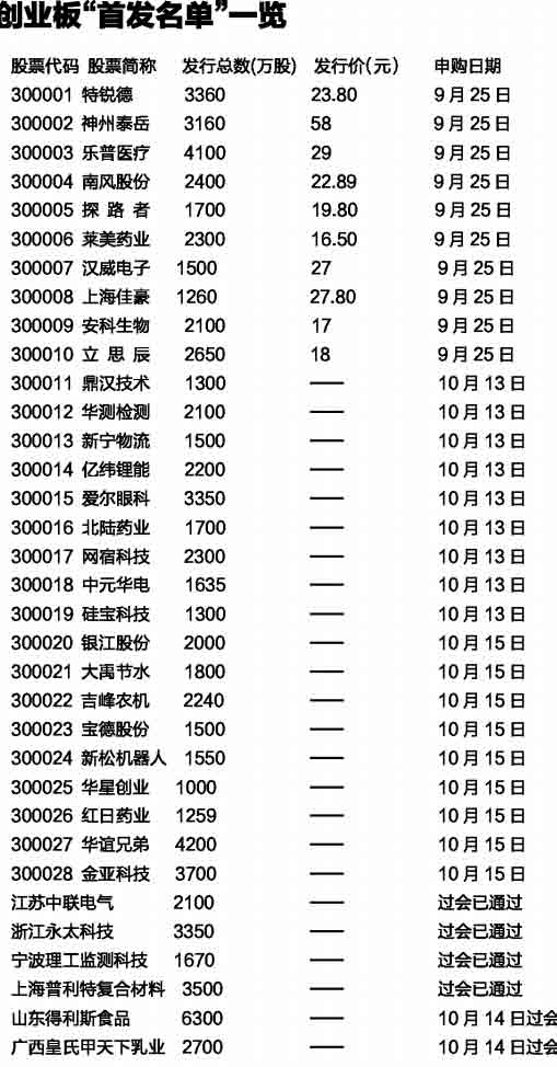 昨天,第三批創業板企業再獲IPO批文。華誼兄弟等9家企業發布招股意向書,昨天起進行網上路演、初步詢價和現場推介,10月13日確定發行價格,10月15日集中申購。自創業板開閘以來,已有28家企業相繼進入招股程序,掛牌上市指日可待。分析人士指出,這28家公司將是創業板開市“首發名單”。