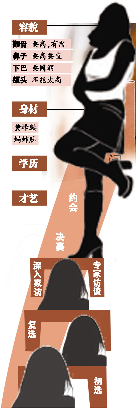 據(jù)主辦方某交友網(wǎng)站華南區(qū)負(fù)責(zé)人程勇生介紹,報名男士必須“證明自己是資產(chǎn)過千萬的單身富豪”,一張“入場券”更是高達(dá)18萬元,女士則無需分文,但對形象、身材、學(xué)歷等有嚴(yán)格限制,必須經(jīng)過嚴(yán)格的層層甄選,相貌、才藝一個都不能少,把這樣的海選說成賽場一點也不為過。