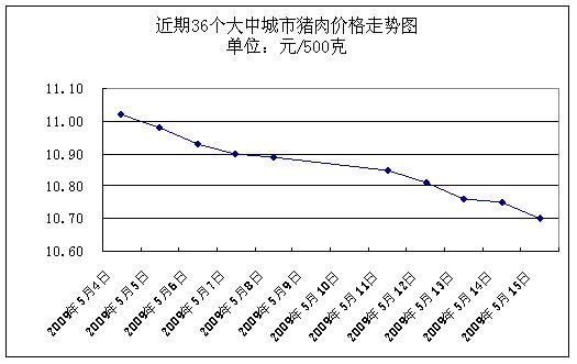 中新網5月18日電 據國家發展改革委價格監測中心監測,上周(2009.5.11-2009.5.15,下同)36個大中城市集市、超市豬肉(精瘦肉)平均零售價格每500克為10.77元,與前一周(2009.5.4-2009.5.8,下同)相比下降1.55%。