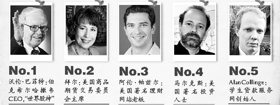 而前美聯儲主席艾倫·格林斯潘位列第八。格林斯潘令世界經濟持續增長,被尊稱為“藝術大師”。但是2008年秋,格林斯潘自由放任的經濟政策飽受責難。美國媒體認為他現在應該做的不是表示驚訝,而是向美國道歉。