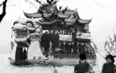 其實,早在1986年,樓外樓飯店就推出了一艘餐飲船,一直?吭跇峭鈽情T前的碼頭。據樓外樓副總經理蔣紅介紹,飯店去年投資近600萬元又推出了一艘“樓外樓號”畫舫,船體金碧輝煌,可供50人游湖、20人用餐。