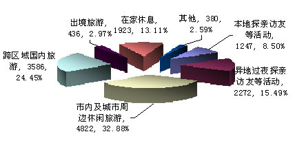 調查結果顯示,57.33%的受訪者計劃在國內旅游,其中:32.88%受訪者有意在市內及城市周邊休閑旅游,24.45%的受訪者有意跨區域國內旅游;2.97%的受訪者計劃出境旅游;23.99%的受訪者有意探親訪友,其中:15.49%的受訪者計劃異地過夜探親訪友;13.11%的受訪者計劃在家休息。