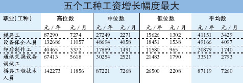 工資增長幅度最大的5個工種分別是模具工,增長了56.53%,年平均工資達到了41151元;設(shè)備保全人員,增長了48.64%,年平均工資達到了49166元;印后制作工,增長了47.04%,年平均工資達到了20879元;通訊交換設(shè)備調(diào)試工,增長了42.31%,年平均工資為33517元;模具工程技術(shù)人員,增長了41.86%,年平均工資高達87119元。(具體工資情況可見表格)