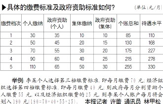 最低的個人繳費標準確定為30元,以20元為級差,向上設立五個檔次的繳費標準,最高一檔為110元。參保農民可根據各自的經濟承受能力自愿選擇一檔繳費,多繳多得。《辦法》對經濟組織設計了5個檔次的繳費標準,從10元至50元不等;對于確無經濟能力的經濟組織,也可以暫不為參保人繳費。