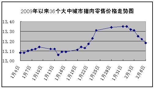 中新網1月19日電 據國家發展改革委價格監測中心監測,上周(2009年2月1日~2009年2月6日,下同)全國36個大中城市集市、超市豬肉(精瘦肉)平均零售價格每500克為13.27元,與春節前一周(2009年1月19日~2009年1月24日,下同)相比上漲0.68%。