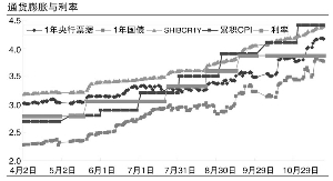 從央行與商業(yè)銀行的互動(dòng)以及資金的供需均衡來看,加息也應(yīng)該是合理的。發(fā)行定向票據(jù)和提高準(zhǔn)備金率實(shí)際上減少了銀行的盈利空間,因此加息則對(duì)銀行而言可以起到補(bǔ)償作用。最近提高準(zhǔn)備金率而隨后沒有加息,但是,央票的利率迅速上升在一定程度上補(bǔ)償了銀行利潤(rùn)損失。未來一個(gè)月,如果央行要保持18.5%以下的貨幣增速,在貨幣乘數(shù)穩(wěn)定的情況下,12月必須提高一次準(zhǔn)備金率,那么央行應(yīng)該順勢(shì)加息一次;否則,央票利率肯定要上升,重復(fù)11月的過程,其表現(xiàn)就是央行所說的市場(chǎng)行為。