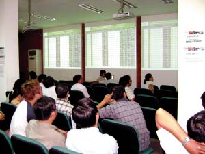 ORS證券公司位于胡志明市第一郡,與胡志明證券交易所一街之隔。隨著越南指數從2007年3月12日的歷史最高點1170點跌至今年6月的370點低位,幾月以來,這里已經成了大多數股民的“傷心地”。不過,昨天上午9點,想在這里找到一個位子已經不太容易。而交易大廳偶爾響起的掌聲更將人們心頭的陰霾一掃而空,“漲了。”幾個股民對自己的收獲很滿意。
