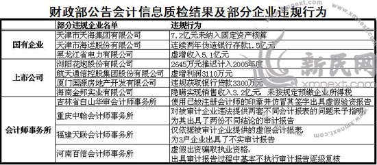 針對檢查發現的問題,各級財政部門依法進行了嚴肅處理。其中,對瀏陽花炮股份有限公司、海南金邦實業有限公司等違規企業予以罰款、補稅、調賬等處理處罰,對相關企業的法定代表人和財務負責人分別予以罰款、吊銷會計從業資格證書等處罰,對應予追究刑事責任的責任人依法移送司法機關處理;對天津市天海集團有限公司等企業的違規問題,依法移送有關地方政府和主管部門核實處理。共有88家會計師事務所、232名注冊會計師分別受到省級以上財政部門給予的警告、暫停執業、吊銷執業資格等處理處罰,其中對吉林省白山華審會計師事務所、河南百信會計師事務所等事務所予以撤銷,對重慶中翰會計師事務所、福建天聯會計師事務所等事務所予以暫停經營業務的處罰。