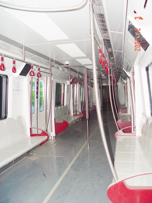 根據北京市軌道交通建設管理公司的介紹,10號線新車內飾以白色為主,配有紅色扶手,為增加車內的美感,車內扶手均帶有弧度。新車車體材料全部采用高強度不銹鋼,車廂內為大通道設計,每輛車每側設4個雙扇內藏電控電動車門,車前端設緊急疏散門。