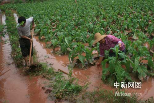黃煙主產(chǎn)區(qū)主田鎮(zhèn)煙農(nóng)在排積水、清洗煙葉泥漬。