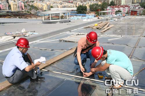 中鐵建工集團技術(shù)人員正在對北京南站太陽能光伏電池板進(jìn)行單體測試